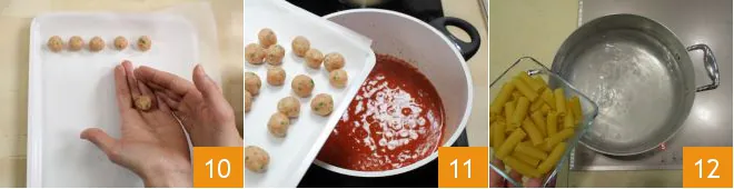 then form small balls and place them on a tray covered with parchment paper 10. Once all the meatballs are prepared, cook them in the previously prepared sauce for about a quarter of an hour over low heat 11. At this point, bring plenty of salted water to a boil in a large pot and cook the rigatoni, then drain them al dente 12.