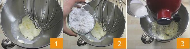 To prepare the espresso tiramisu, start by making the mascarpone cream, mixing with a stand mixer or electric beater the mascarpone 1 with the sifted powdered sugar 2, the cold milk and cold cream 3, and the seeds from half a vanilla pod (or a packet of vanillin): you should obtain a soft and well-whipped cream. Transfer it to a pastry bag with a star nozzle and store it in the refrigerator.