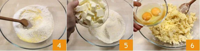 Proceed with making the paste di meliga (click here for more instructions): place the fine cornmeal, sifted all-purpose flour, a pinch of salt, vanillin (or seeds from half a vanilla pod), and granulated sugar in a bowl and mix with a wooden spoon 4. Add the softened butter cut into pieces 5 and grate the zest of a lemon into the mixture. Add the egg and the yolk and incorporate them well into the mixture 6, mixing with a wooden spoon: you should obtain a creamy, soft, and homogeneous dough.