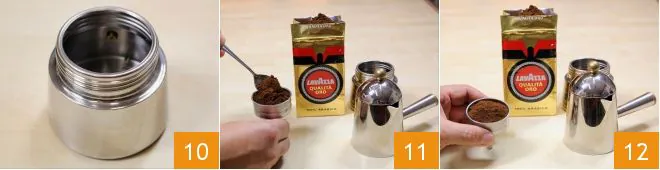 Now prepare the coffee using a traditional coffee maker. To get excellent coffee, fill the boiler of your coffee maker with cold water, preferably low in calcium, making sure not to exceed the safety valve 10 (otherwise you'll get a longer coffee). Fill the filter with ground coffee forming a small mound 11, which you will level by tapping the filter on the table with decisive movements 12. Do not press with a spoon, nor make holes.