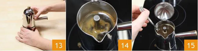Screw the coffee maker tightly 13 (to prevent coffee from leaking from the sides as it rises), then place it over a low, steady flame, to get a rich coffee. As the coffee rises, a thick froth will form 14; we recommend not letting the coffee bubble too long, to keep its aroma and sweetness intact. Your coffee is ready: before pouring it, stir it directly in the moka with a teaspoon to make it more homogeneous 15.