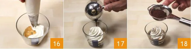 At this point, you can assemble the espresso tiramisu. Squeeze a dollop of mascarpone cream at the bottom of the glass and place the paste di meliga on top with the flat side facing up. Cover the cookie with another generous dollop of cream 16 and pour about 1.4 oz of hot coffee around the cream 17. Finally, lightly dust the espresso tiramisu with cocoa powder 18 and enjoy!