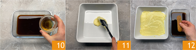 Finally, flavor the now cold coffee with the rum 10. You are ready to assemble the dessert: take a 9.5 x 9.5-inch baking dish and cover the base with a spoonful of cream 11, covering the entire surface. Quickly dip the ladyfingers in the coffee 12 and create a first layer; a few seconds per side will suffice, otherwise they will absorb too much liquid and release it during fridge rest.