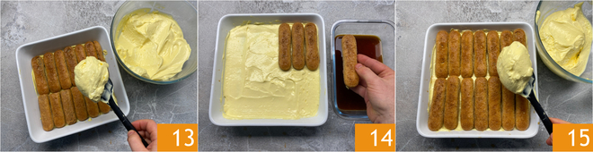 Continue with a generous layer of cream 13 and level. Make a second layer of coffee-soaked ladyfingers 14 and cover with the remaining cream 15.