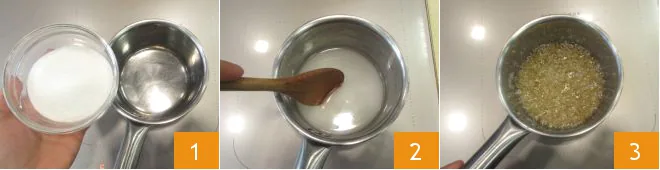 To prepare the toffee sauce, pour the water into a saucepan, add the sugar 1, and stir to mix the two ingredients well 2, then turn on the heat and let it come to a boil over medium flame without stirring further 3.