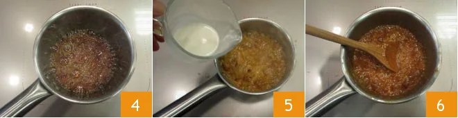 When the mixture has reached a light amber color 4, remove the saucepan from the heat and slowly pour in the fresh liquid cream 5, stirring with a wooden spoon 6; be sure to add the cream gradually as indicated, being very careful of the steam and bubbles that will form.