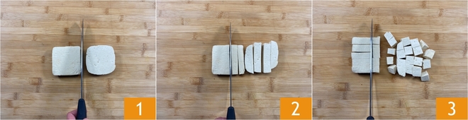 To prepare the tofu in the air fryer, first, pat dry the block of tofu with a paper towel, then cut it in half 1 and then into strips 2. Finally, cut into cubes about 1/2 inch large 3.