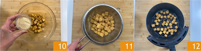 Bread them with breadcrumbs 10 and remove the excess with a sieve 11 before transferring them into the air fryer basket (we used a 6-liter capacity fryer) 12.