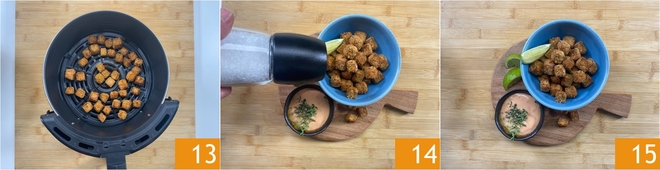 Cook at 356°F for 15-16 min until the cubes are well browned 13. Transfer to a small bowl, add a good pinch of salt 14, and serve the tofu with your favorite sauce 15.