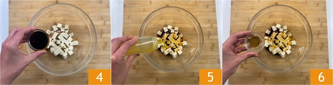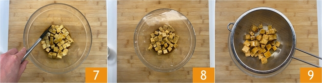 Mix 7, cover with plastic wrap 8 and let marinate for at least 15 minutes. Then drain the cubes from the marinade 9.