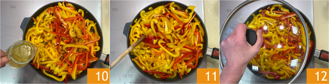 Pour in the broth 10, stir 11, cover with a lid 12, and cook on low heat for 15-20 minutes. At the end of cooking, remove the cloves.