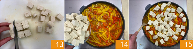 In the meantime, cut the tofu into 1/2 inch cubes 13. Once the peppers are cooked, add the tofu to the pan 14 and stir 15.
