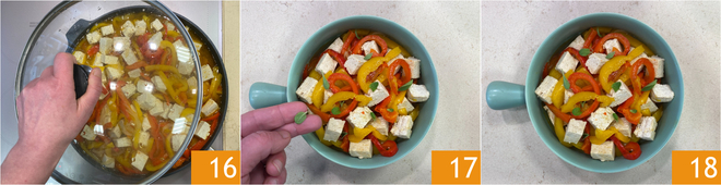 Cover again with the lid 16 and continue cooking for another 10 minutes. Plate and finish with a few marjoram leaves 17. Tofu with peppers is ready to be served 18.