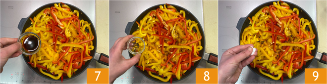 Also, slice the onion into thin slices 4. In a non-stick pan, pour the oil, add the onion 5 and the peppers 6.