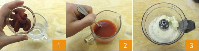 To prepare the tomato shortcrust pastry, start by mixing the tomato paste in the ice-cold water (1-2). Proceed with the technique of sablage: place the sifted flour, cold butter cut into pieces from the fridge 3, a pinch of salt in a food processor, and blend everything until you get a sandy-looking mixture. It's important that the butter is cold because this way it prevents it from melting too quickly during baking and making the pastry hard.