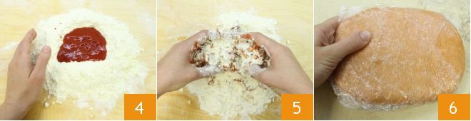At this point, place the mixture obtained on a floured surface in the classic well shape and add the diluted tomato paste in the center 4, knead everything quickly 5 until you get a compact, firm, and fairly elastic dough. Once ready, wrap your shortcrust pastry in a sheet of plastic wrap 6 and let it rest in the fridge for at least 40 minutes. After 40 minutes, the shortcrust pastry will be ready to use.
