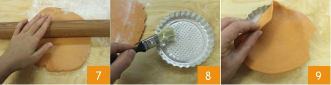 Place the shortcrust pastry dough on a slightly floured surface and roll it out with a rolling pin 7 to a very thin thickness, about 1/8 to 1/6 inch, butter 8 and flour the selected baking pan, and lay the pastry over the pan 9, making sure it adheres well. At this point, let the shortcrust pastry rest in the refrigerator for 30 minutes or 15 minutes in the freezer to ensure it firms up and holds its shape better.