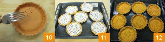 Remove the pan from the refrigerator and prick the bottom of the shortcrust pastry with the tines of a fork 10, but be careful not to go too deep, or you might pierce the bottom and risk the filling escaping. Now you can proceed by filling the pie with the desired filling, or you can bake the pastry following the blind baking method. For all the details, consult our cooking school on how to How to do blind baking. Cut a circle of parchment paper the same diameter as the pan and place the circle inside the pan, arranging it to cover the edges as well. Then place dry beans or weights suitable for this type of baking inside the mold 11. Preheat the oven to 392°F and bake the pastry in a static oven for about 15-20 minutes. Unmold and remove the beans and parchment paper; at this point, the edges will be well browned but not the bottom, so bake again for 10-15 minutes at the same temperature so that the pastry dries out and becomes golden. Remove the base from the oven and brush it with beaten egg on the base to seal the filling, then bake it in a hot oven for a couple of minutes so that the egg forms a sealing film. Once cooked, take out the tomato shortcrust pastry bases from the oven and fill them with the fillings you prefer 12.