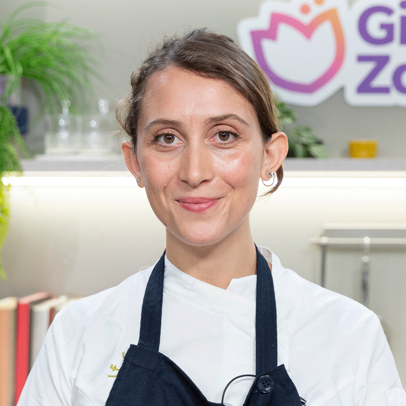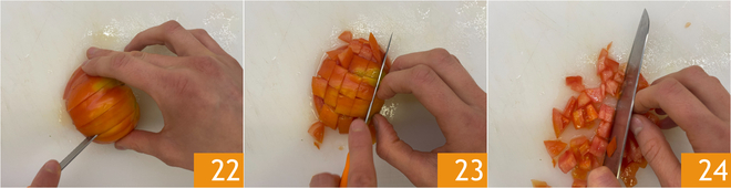 In the meantime, focus on the tomato tartare: cut the tomato first into slices 22 and then into cubes 23. Finally, chop it with a knife 34.