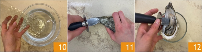 Now move on to the oysters: first, soak the gelatin sheets in cold water 10. Open the oysters with the appropriate knife 11, taking care to use gloves or a cloth to protect your hands, then remove the mollusk 12.