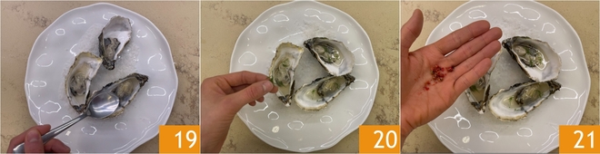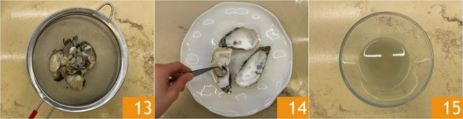 Filter the oyster water 13. Place the mollusks back into the shells 14, after cleaning them thoroughly and removing the part that attaches the mollusk to the shell. Keep aside 60 ml (about 2 oz) of oyster water for the jelly 15, and a couple of tablespoons for the tomato tartare.