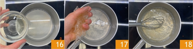 Now pour the 60 ml (about 2 oz) of oyster water into a saucepan, add the vermouth 16, and bring almost to a boil. When it is about to boil, turn off the heat and add the drained and well-squeezed gelatin 17, then stir with a whisk to dissolve it completely 18.