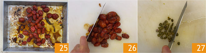Retrieve the confit cherry tomatoes that will now be cooked 25 and also chop them finely 26. Desalt and chop the capers 27.
