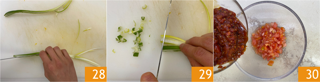 Remove the green part of the scallion, divide it lengthwise 28, and slice it thinly 29. In a bowl, combine the fresh tomato tartare with the confit cherry tomato tartare 30.