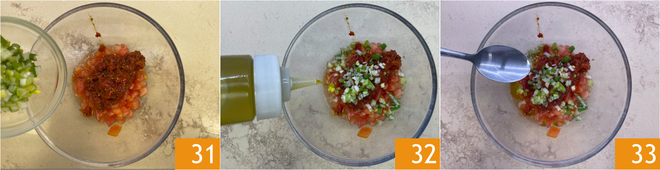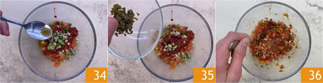 Finally, season with green Tabasco 34 and capers 35, adjusting the amount based on the saltiness of the mixture. Mix well to combine everything 36.