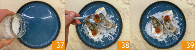 You are ready to plate: create a bed of coarse salt at the base of the plate 37, then place 2 oysters on top 38; this way they will stay in place. Use a small ring mold to add the tartare alongside the jelly inside each shell 38; you can vary the quantities to create different taste experiences. Your tomato tartare in two textures with oyster gelée is ready to be served 39!