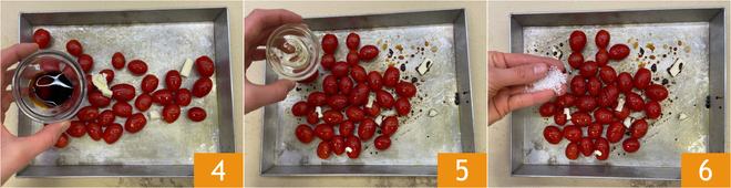 Add the balsamic vinegar 4, honey 5, and salt flakes 6.