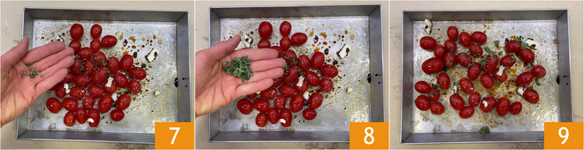 Finally, season with thyme 7 and marjoram leaves 8. Shake the dish to distribute the seasoning well, then bake in a static oven at 320°F for about 2 and a half hours 9.