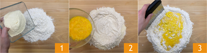 To prepare the tonnarelli cacio e pepe, start with the fresh pasta: place both the flour and semolina on the work surface 1 and create the classic well. Add the eggs in the center 2 and begin to mix, gradually incorporating the flour 3.
