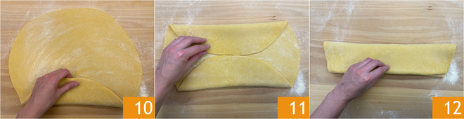 When the sheets have dried, lightly dust the surface with a small amount of semolina and fold it onto itself: first one edge 10, then the other 11, and finally, close by matching the two edges 12.