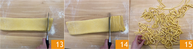 Cut the tonnarelli by slicing the roll from the narrow side with a sharp knife 13 to a thickness of about 1/16 to 1/8 inch 14. Once ready, place the prepared tonnarelli well spread out 15 on a tray lined with a dry kitchen towel and sprinkled with semolina.