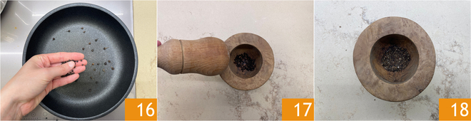 Let's move on to the seasoning: in a slightly warm pan, toast the mix of two peppers, black pepper and Cubeb pepper (if you don't have it you can omit it) 16. When an intense scent of pepper is released from the pan, it indicates the toasting is done. Transfer it to a mortar 17 and crush it to your preferred grain: we left it fairly coarse 18.