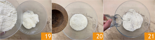 In a fairly large bowl, pour the grated Pecorino Romano, also add the grated Parmigiano Reggiano DOP 19, add the pepper 20 and the cold water 21.