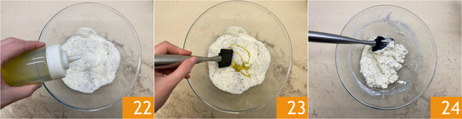 Before starting to mix, add a little oil 22 (optional, it serves to polish), then stir vigorously 23: you should obtain a homogeneous mixture, creamy but not runny, almost like mortar consistency 34.
