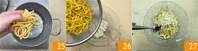 Bring the water to a boil, salt to taste, and cook the fresh tonnarelli 25 for about 7 minutes. Drain and transfer them directly to the bowl 26, then mix immediately very quickly with a spatula to blend with the seasoning 27. Add a little pasta cooking water if needed, for a creamy result.