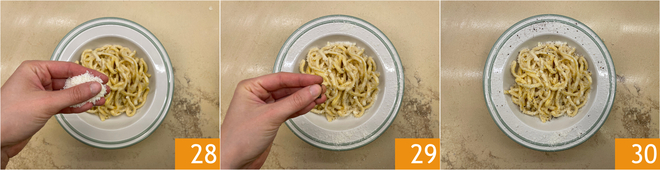It's time to plate, add more Pecorino Romano to taste 28, some ground pepper 29, and the tonnarelli cacio e pepe are ready to be devoured 30!