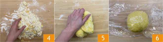 Knead for about 10 minutes 4, until you obtain a smooth and homogeneous dough 5. Wrap it in plastic wrap and let it rest for at least 30 minutes 6.