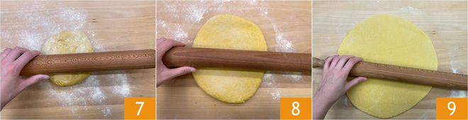 After the resting time, take one piece of dough at a time, keeping the rest covered. Roll out the dough with a rolling pin 7 8, dusting occasionally with semolina. The pasta should be kept rather thick, about 1/6 inch. Once rolled out 9, the sheet should dry, uncovered, for about 30-40 minutes. You can then roll out the other pieces and proceed in the same way.