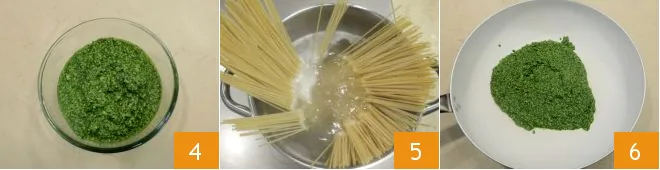 Blend intermittently, adding the remaining oil gradually, little by little, until you reach the desired creamy consistency 4. Once ready, proceed to cook the tonnarelli in salted boiling water to taste 5; then transfer the pesto to a non-stick pan.