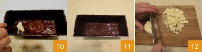 Again, use a kitchen brush to adhere the melted chocolate to the edges of the mold 10 to create a new layer of chocolate 11. This operation is necessary to ensure that the two layers of chocolate compact better, creating a greater thickness that will later allow for easier removal of the nougat from the mold. Place it back in the refrigerator to solidify for at least 30 minutes. Meanwhile, proceed with the filling: finely chop the white chocolate 12.