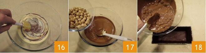 Be sure to mix the ingredients until the white chocolate is still warm 16 and finally add the whole shelled hazelnuts 17, mixing the ingredients well. At this point, the chocolate in the mold will be solid: remove the mold from the refrigerator and pour in the mixture you just obtained 18.