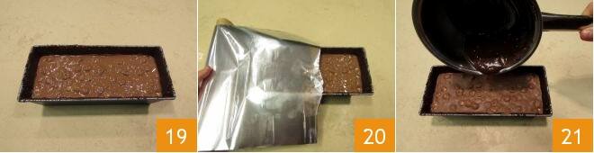 Level it in the mold 19, using a spatula. Then place in the refrigerator for at least 4-5 hours, covering the mold with a sheet of aluminum foil 20. Ensure that the aluminum sheet does not touch the mixture to prevent it from sticking in the fridge. After the nougat has cooled, ensure the surface is firm and melt the remaining 100 g of dark chocolate in a bain-marie, pouring it over the nougat 21.