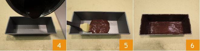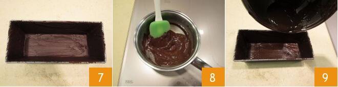 Then pour the melted chocolate into a tapered loaf pan that measures 8.7x3.1 inches at the base, 10.2x4.3 inches on the surface, and with a height of 2.95 inches 4: use a kitchen brush to spread the melted chocolate over the entire surface of the mold to cover it completely (5-6).