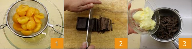 To prepare the chocolate cake with apricots and amaretti, drain the apricots from the preservation liquid 1. Then chop the dark chocolate 2 and place it in a saucepan to melt over very low heat along with the butter 3.
