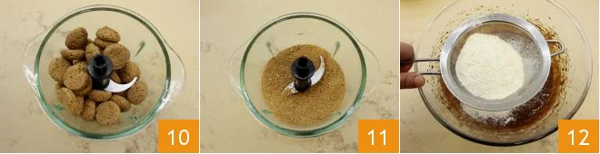 Then set aside 12 amaretti and chop the rest to reduce them to powder (10-11); sift the flour into the mixture 12 and mix with a spatula;