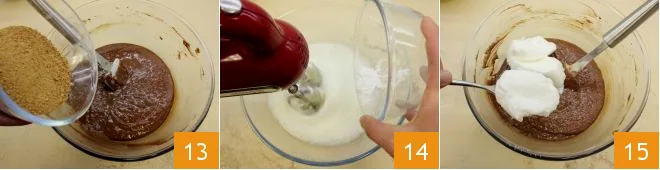 then add the amaretti powder and mix everything well 13. Beat the egg whites until stiff with the remaining powdered sugar 14. Gently fold the egg whites into the mixture, stirring from top to bottom to prevent them from deflating 15.